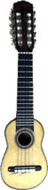 Utiliza 5 cuerdas dobles, aunque también se fabrican de 4. Tiene al menos 2 octavas, es decir, como mínimo 14 trastes.